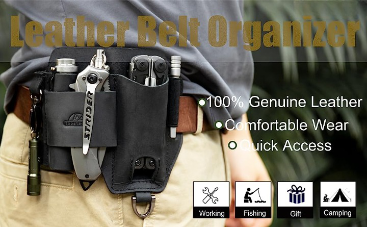 As a perfect organizer on belt to free your messy pocket,this leather multitool sheath really makes "ALL in One" come true,it has 3 pouches for Multitool / Flashlight / Tactical pen/ and a 360° Rotation key holder for Car Keys,a Elastic Band for Extension Kits and a Logo band for Big knife with clip.