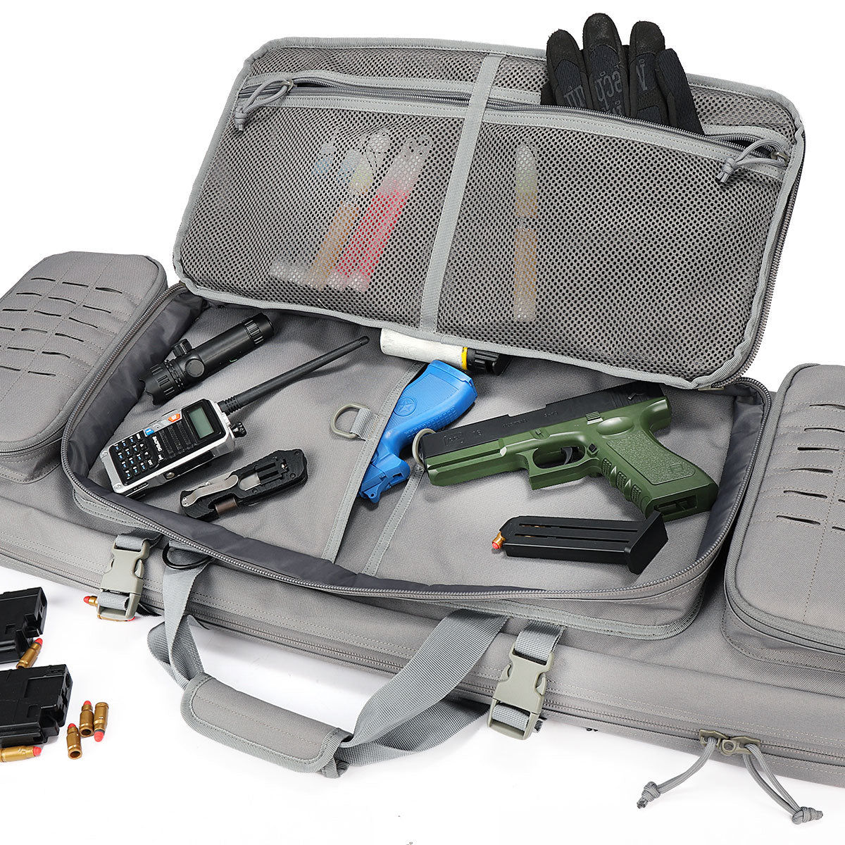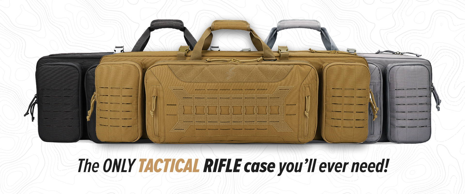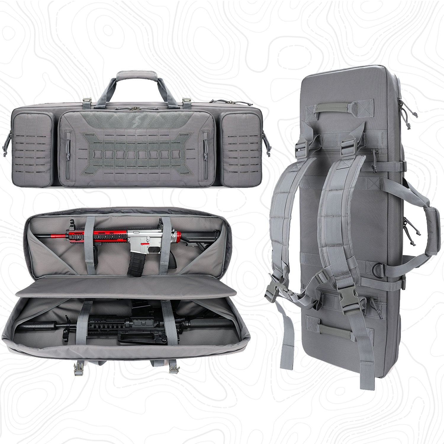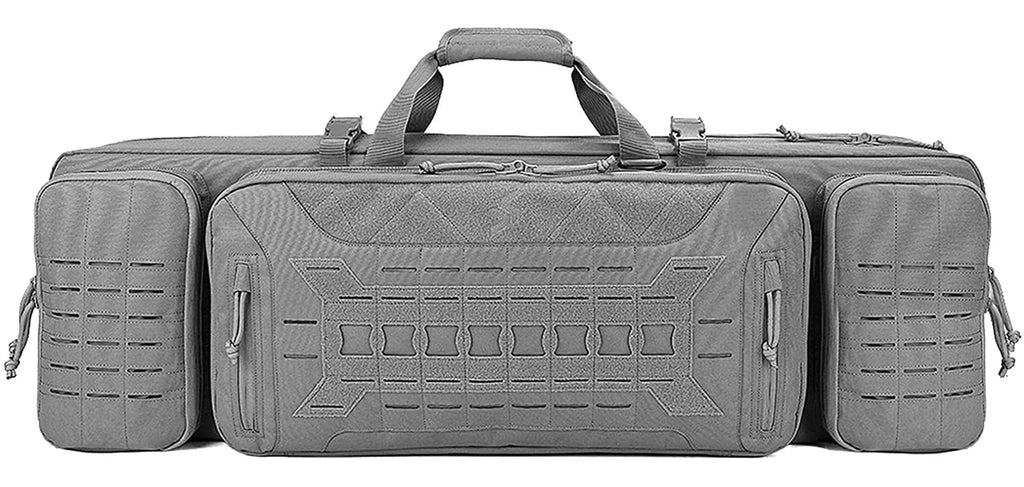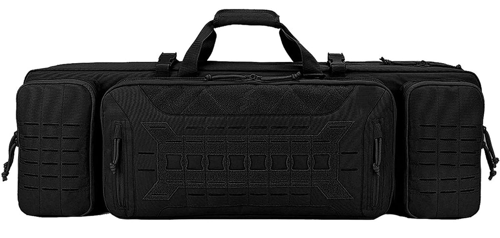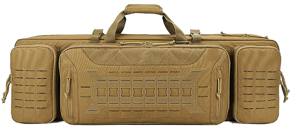 The Tactical Rifle case Holds 2 rifles and 2 pistols, with ample storage in the front for your range accessories. Laser Cut MOLLE compatible webbing for extra customization.