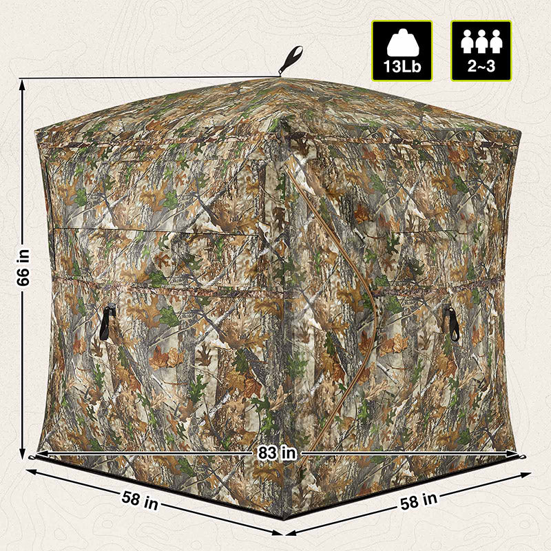 Adequate Space: Dimensions: 65” height, hub to hub 75" x 75", and with a floor space of 58" x 58". 2TACTIC hunting blinds can comfortably accommodate two or three hunters.
