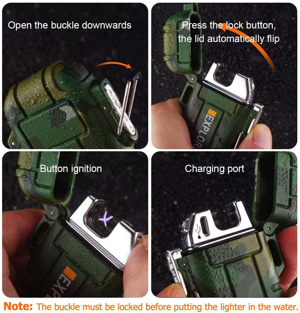 Waterproof Design - waterproof lighter,metal-ring sealed lighter cover and locking clasp, IP56 WATERPROOF SYSTEM, water does not seep inside, no fear of rain, this waterproof lighter is your best choice when you go camping, traveling, survival tactical or hiking, arc lighter waterproof.